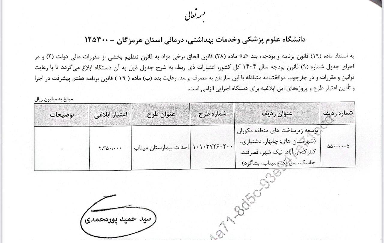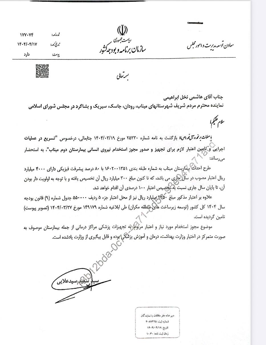 🔹 همچنین طبق ابلاغیه شماره ۱۳۰۲/۰۳/۲۷ مربوط به طرح توسعه سواحل مکران، مبلغ ۲۳۵۰ میلیارد ریال اعتبار اضافی در قالب ردیف ۵۵۰۰۰۰ جدول (۹) قانون بودجه نیز برای زیرساختهای درمانی شرق استان از جمله بیمارستان میناب منظور گردیده که تأمین آن نیز در دستور کار است.